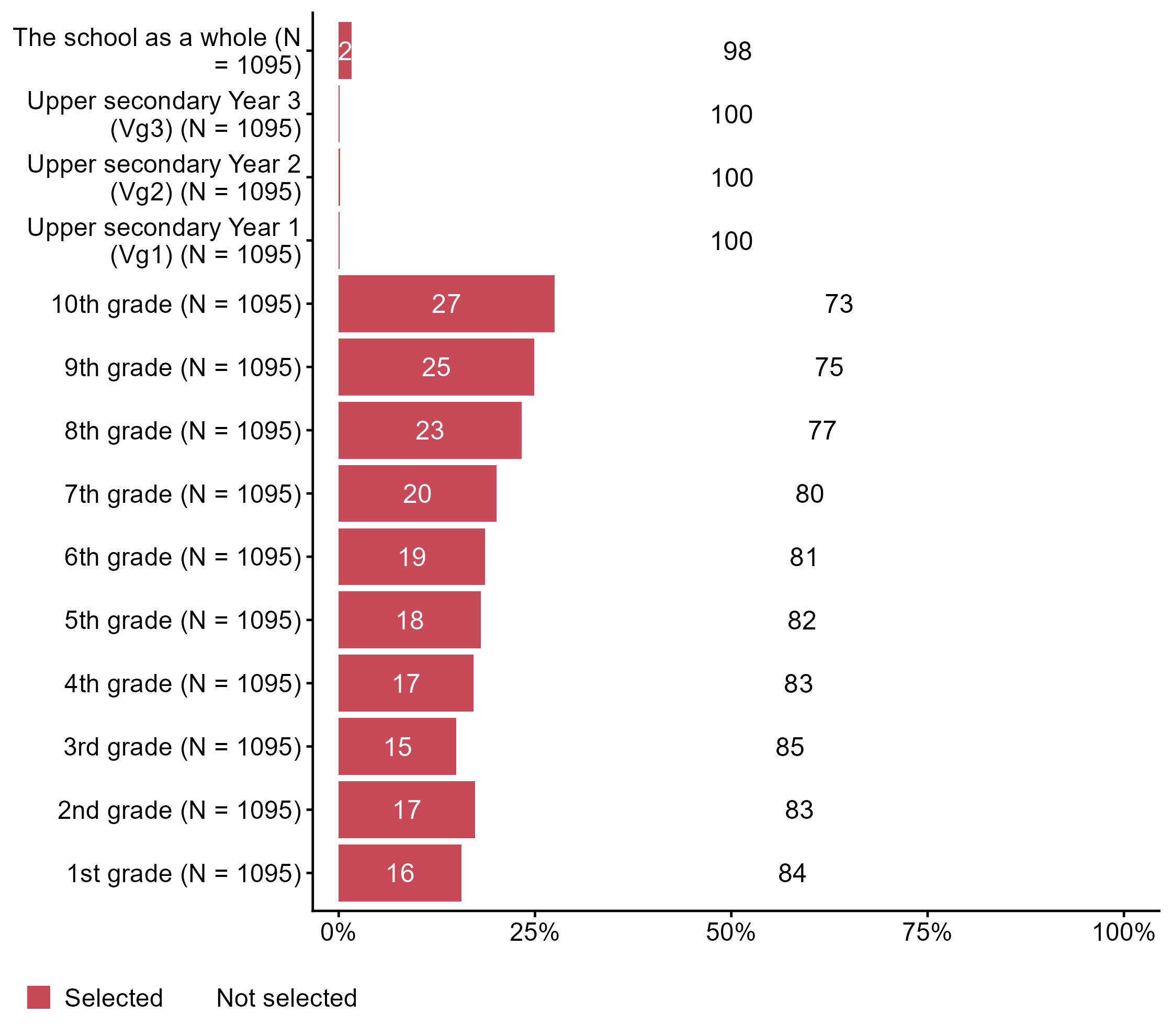 Figur 3.1.Which grade levels do you teach?. N = 1095, Figur (PNG), Figurdata (XLSX). (Q_LS7_1,Q_LS7_2,Q_LS7_3,Q_LS7_4,Q_LS7_5,Q_LS7_6,Q_LS7_7,Q_LS7_8,Q_LS7_9,Q_LS7_10,Q_LS7_11,Q_LS7_12,Q_LS7_13,Q_LS7_14,Q_LS7_15)