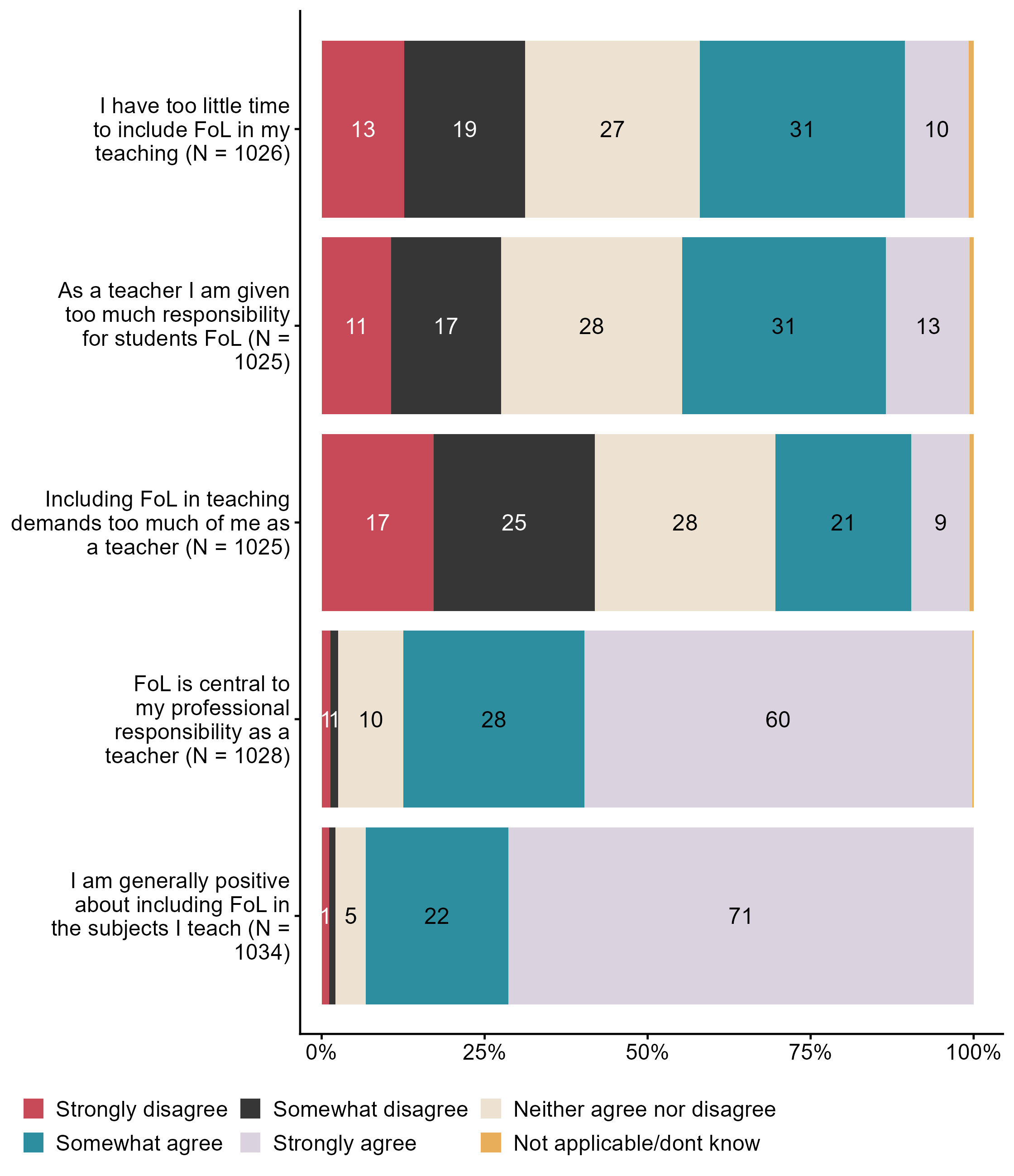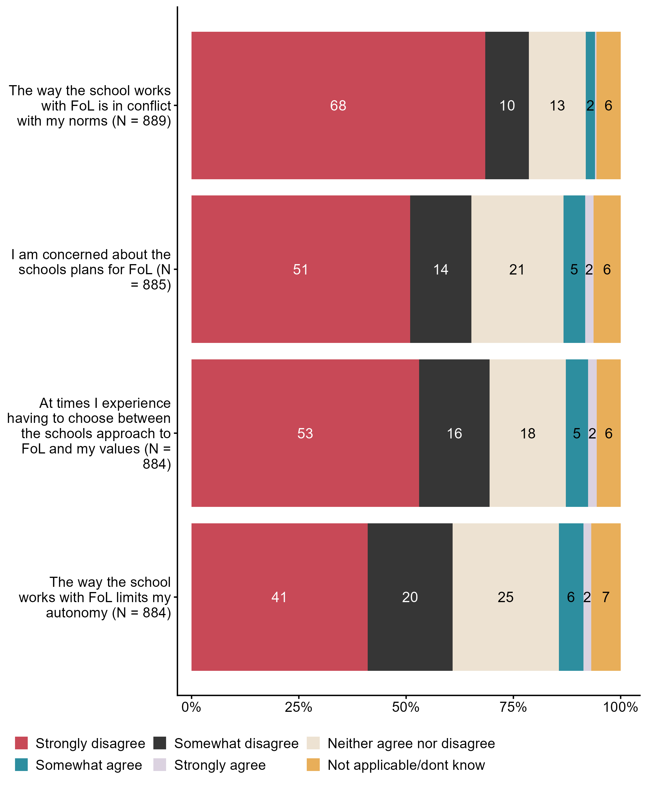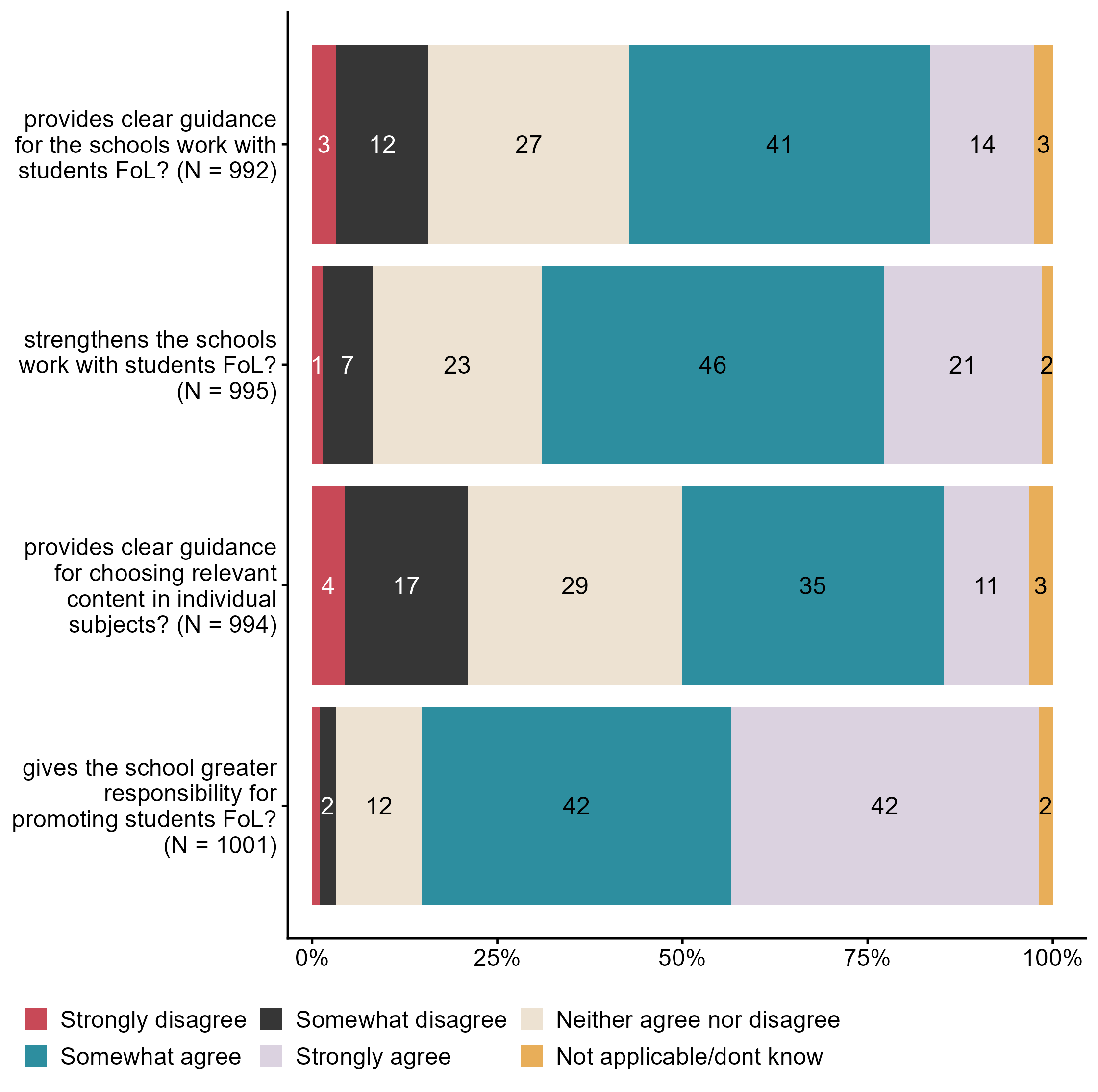 Figur 3.5.To what extent do you agree that the introduction of public health and life skills (FoL) in LK20. N = [992–1001], Figur (PNG), Figurdata (XLSX). (Q_LS17_1,Q_LS17_2,Q_LS17_3,Q_LS17_4)