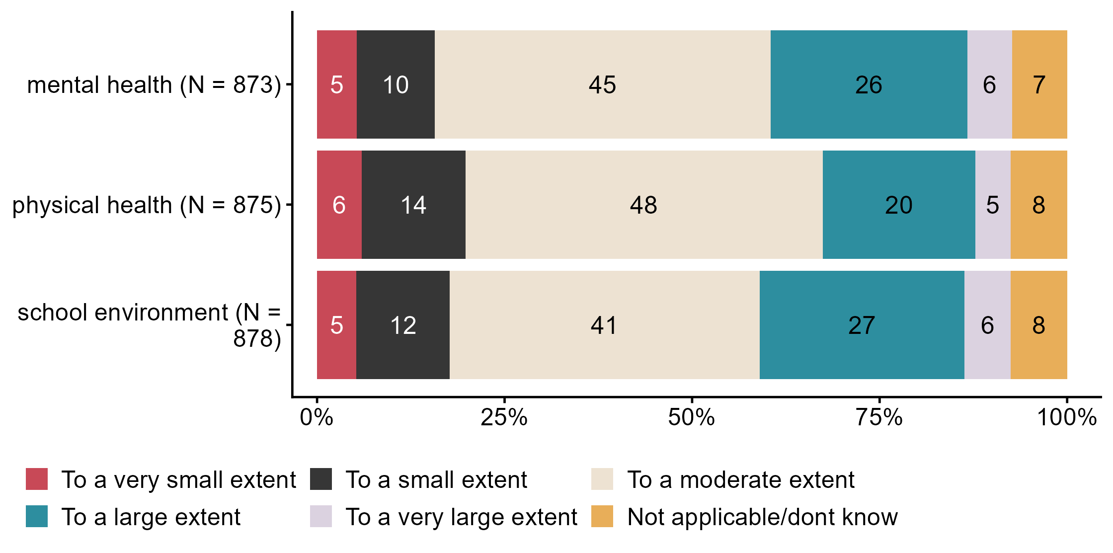 Figur 3.22.Overall, to what extent do you feel that the introduction of public health and life skills in LK20 has improved the school’s work with students’. N = [873–878], Figur (PNG), Figurdata (XLSX). (Q_LS39_1,Q_LS39_2,Q_LS39_3)