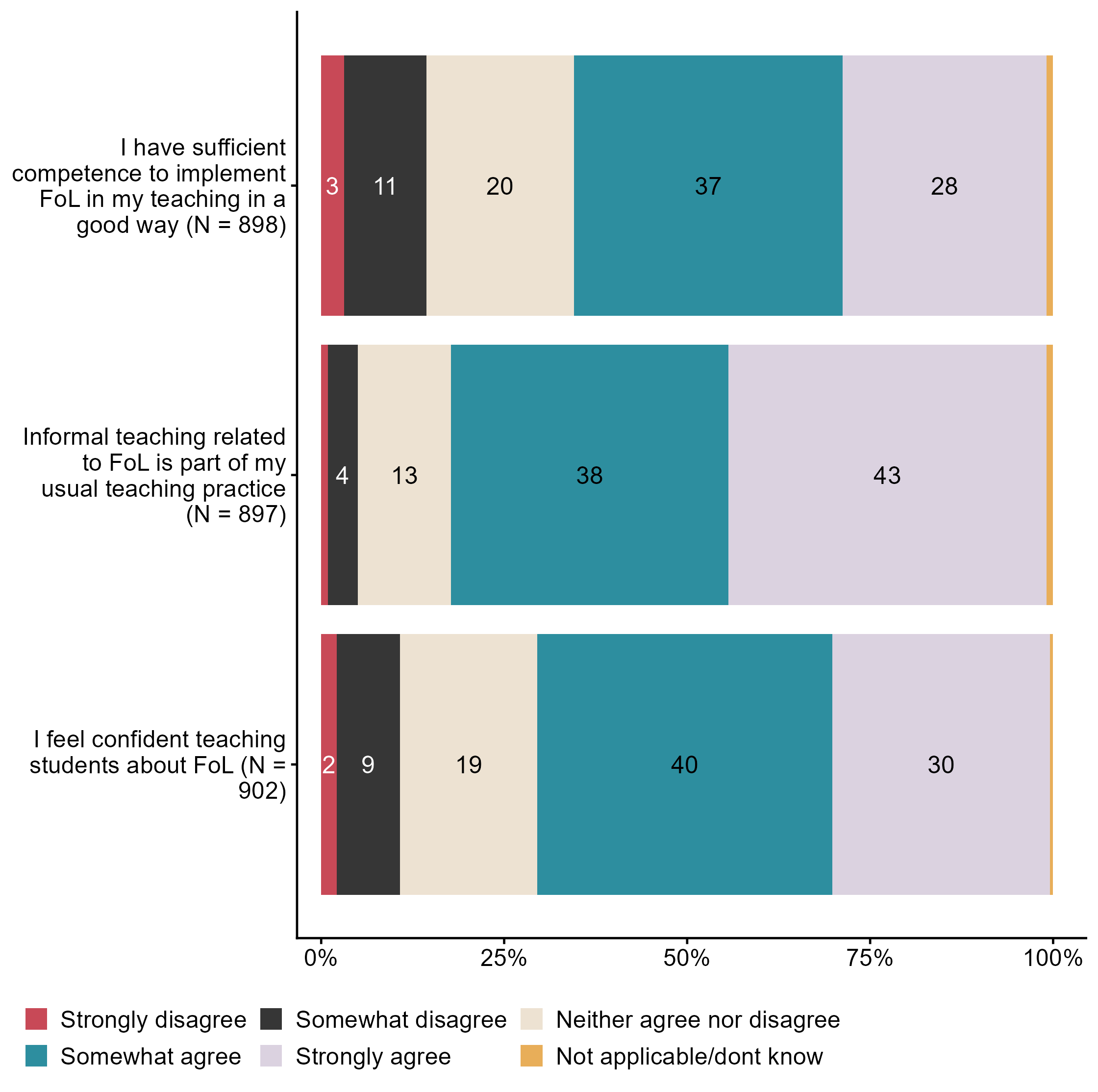 Figur 3.12.To what extent do you agree with the following statements about your competence in public health and life skills (FoL)?. N = [897–902], Figur (PNG), Figurdata (XLSX). (Q_LS27_1,Q_LS27_2,Q_LS27_3)