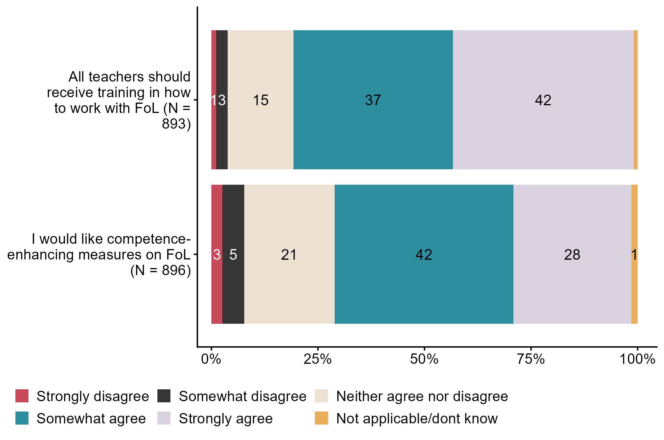 Figur 3.14.To what extent do you agree with the following statements about competence-enhancing measures within public health and life skills (FoL)?. N = [893–896], Figur (PNG), Figurdata (XLSX). (Q_LS29_1,Q_LS29_2)