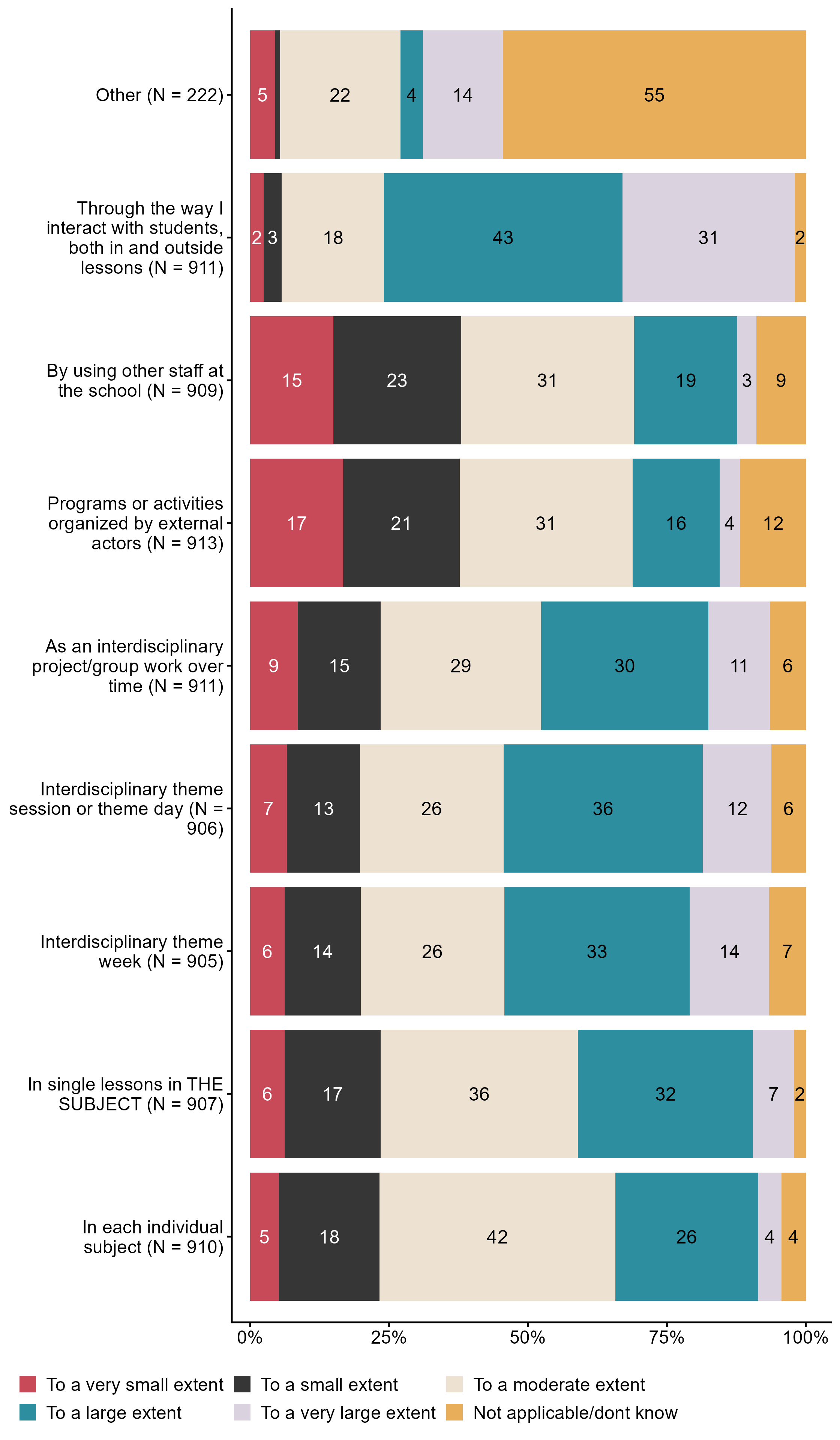 Figur 3.9.How do you organize work with public health and life skills?. N = [222–913], Figur (PNG), Figurdata (XLSX). (Q_LS23_1,Q_LS23_2,Q_LS23_3,Q_LS23_4,Q_LS23_5,Q_LS23_6,Q_LS23_7,Q_LS23_8,Q_LS23_9)