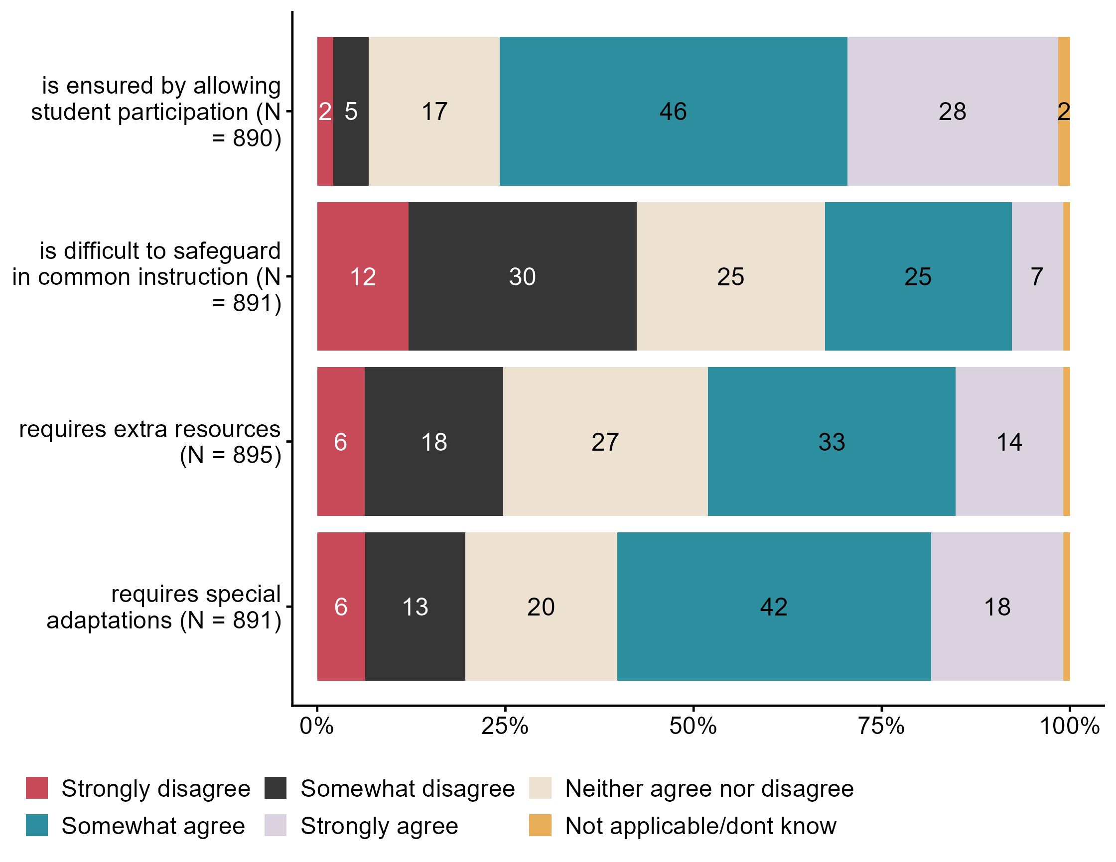 Figur 3.16.How much do you disagree/agree with the following statements. Ensuring that all students experience belonging when working with public health and life skills. N = [890–895], Figur (PNG), Figurdata (XLSX). (Q_LS32_1,Q_LS32_2,Q_LS32_3,Q_LS32_4)