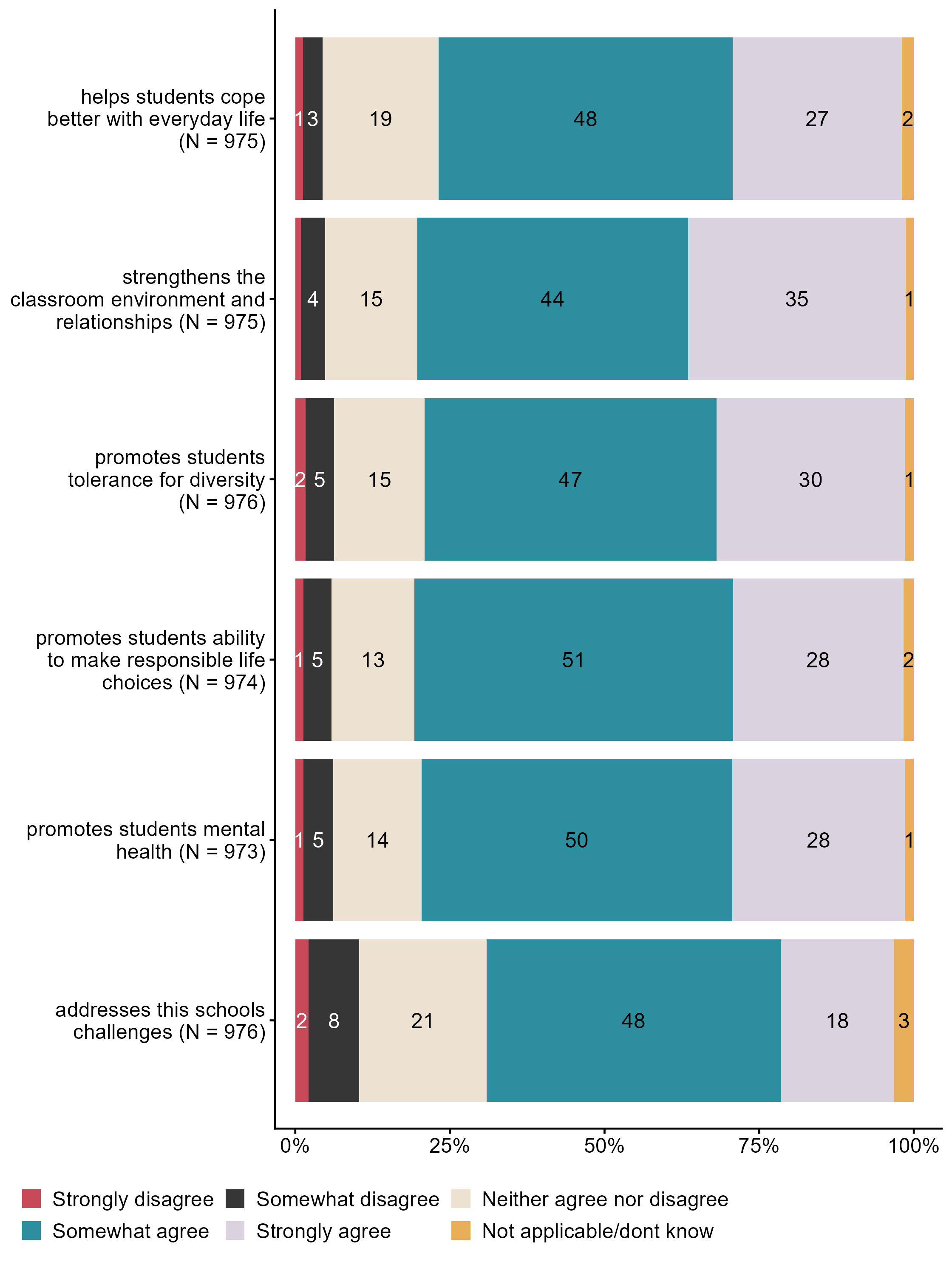 Figur 3.6.To what extent do you agree that your school’s work with the theme public health and life skills. N = [973–976], Figur (PNG), Figurdata (XLSX). (Q_LS18_1,Q_LS18_2,Q_LS18_3,Q_LS18_4,Q_LS18_5,Q_LS18_6)