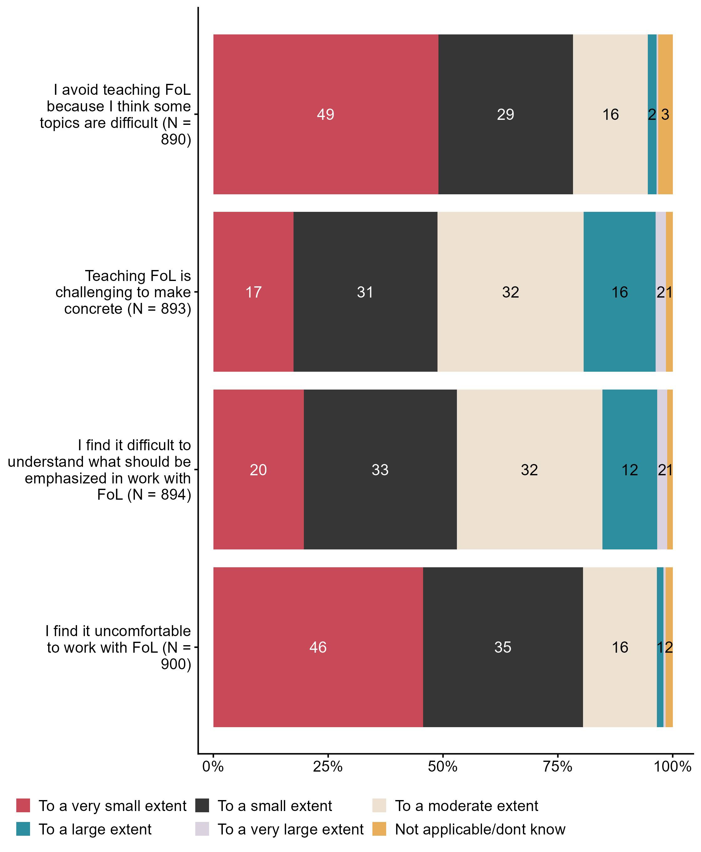 Figur 3.13.To what extent do you experience challenges connected to work with public health and life skills (FoL)?. N = [890–900], Figur (PNG), Figurdata (XLSX). (Q_LS28_1,Q_LS28_2,Q_LS28_3,Q_LS28_4)