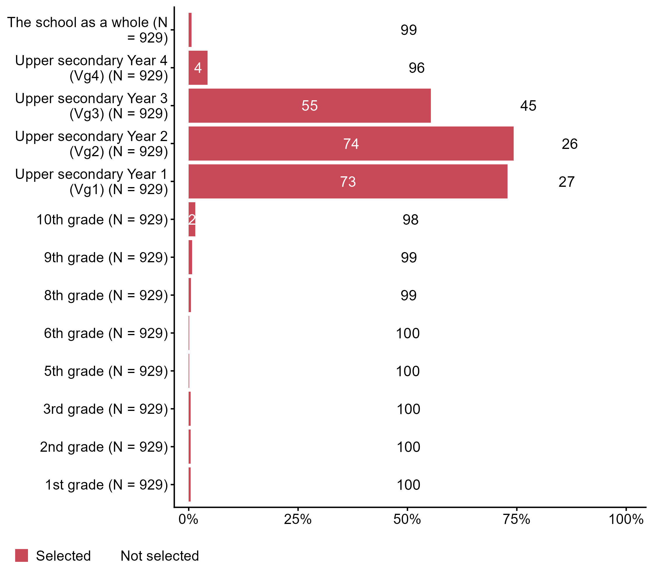 Figur 7.1.Which grade levels do you teach?. N = 929, Figur (PNG), Figurdata (XLSX). (Q_LS7_1,Q_LS7_2,Q_LS7_3,Q_LS7_4,Q_LS7_5,Q_LS7_6,Q_LS7_7,Q_LS7_8,Q_LS7_9,Q_LS7_10,Q_LS7_11,Q_LS7_12,Q_LS7_13,Q_LS7_14,Q_LS7_15)