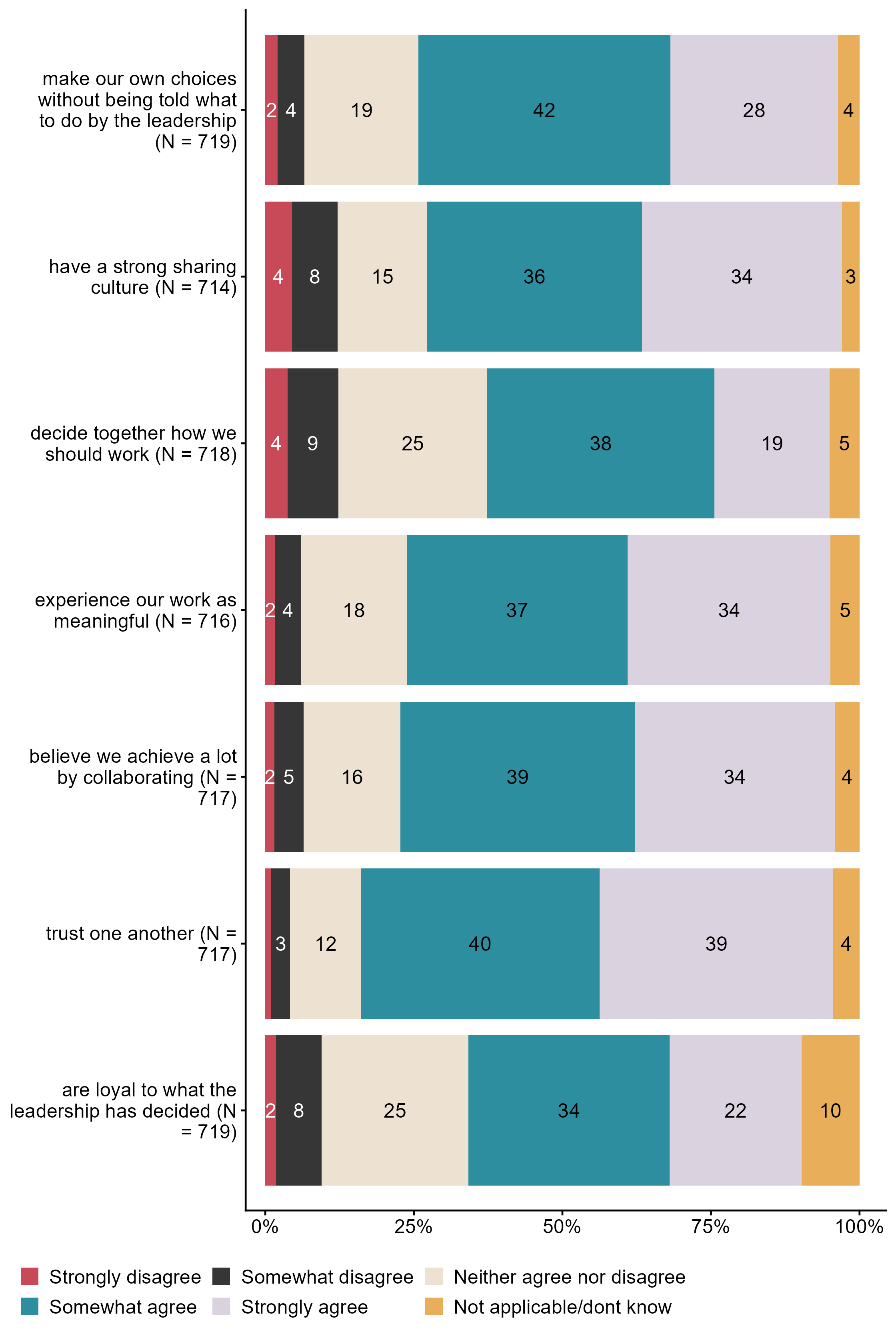 Figur 7.21.In collaboration on public health and life skills I find that teachers at my school. N = [714–719], Figur (PNG), Figurdata (XLSX). (Q_LS38_1,Q_LS38_2,Q_LS38_3,Q_LS38_4,Q_LS38_5,Q_LS38_6,Q_LS38_7)