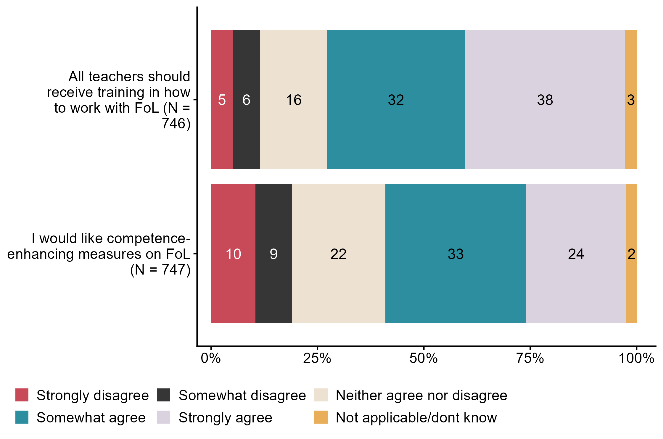 Figur 7.14.To what extent do you agree with the following statements about competence-enhancing measures within public health and life skills (FoL)?. N = [746–747], Figur (PNG), Figurdata (XLSX). (Q_LS29_1,Q_LS29_2)