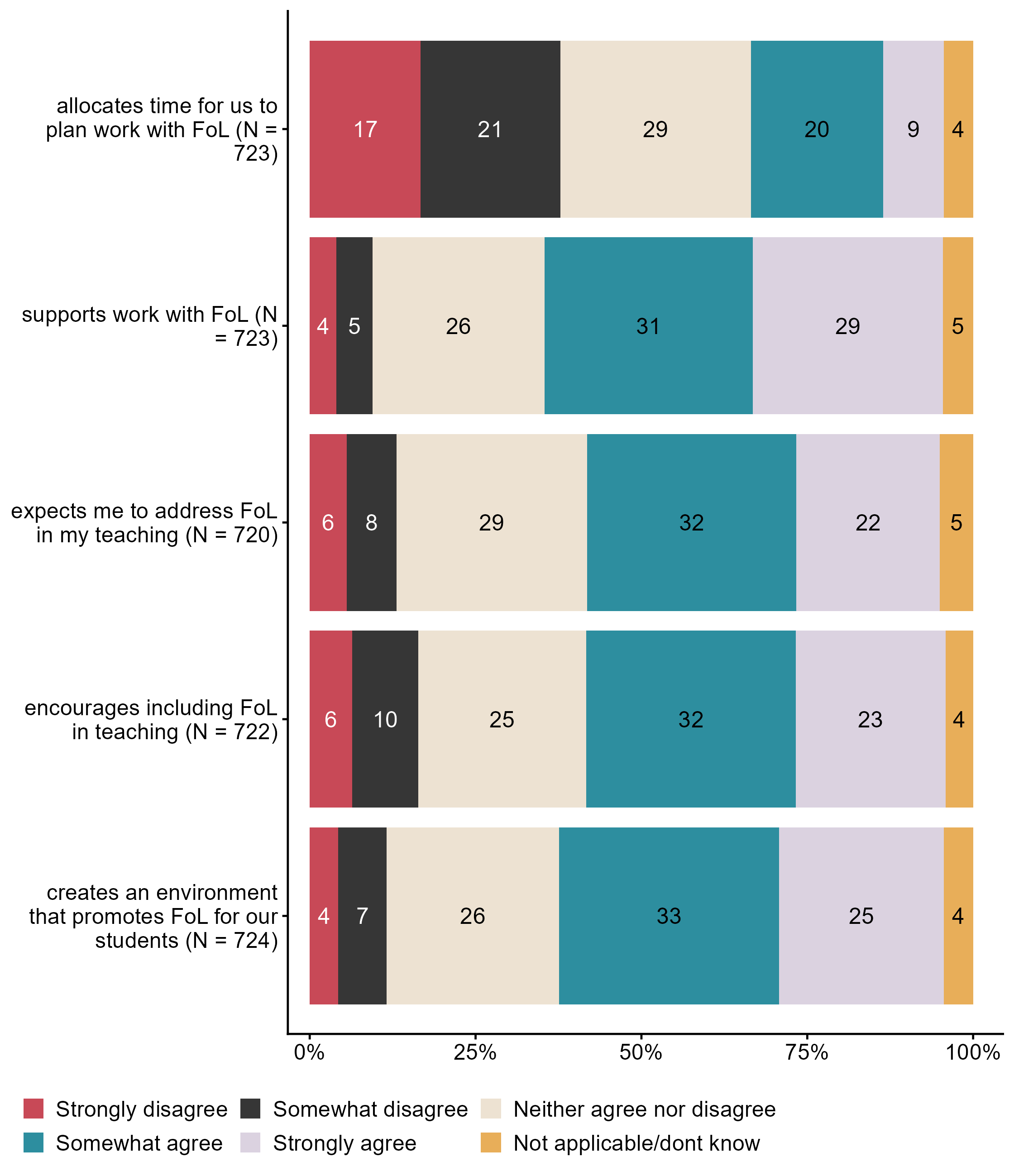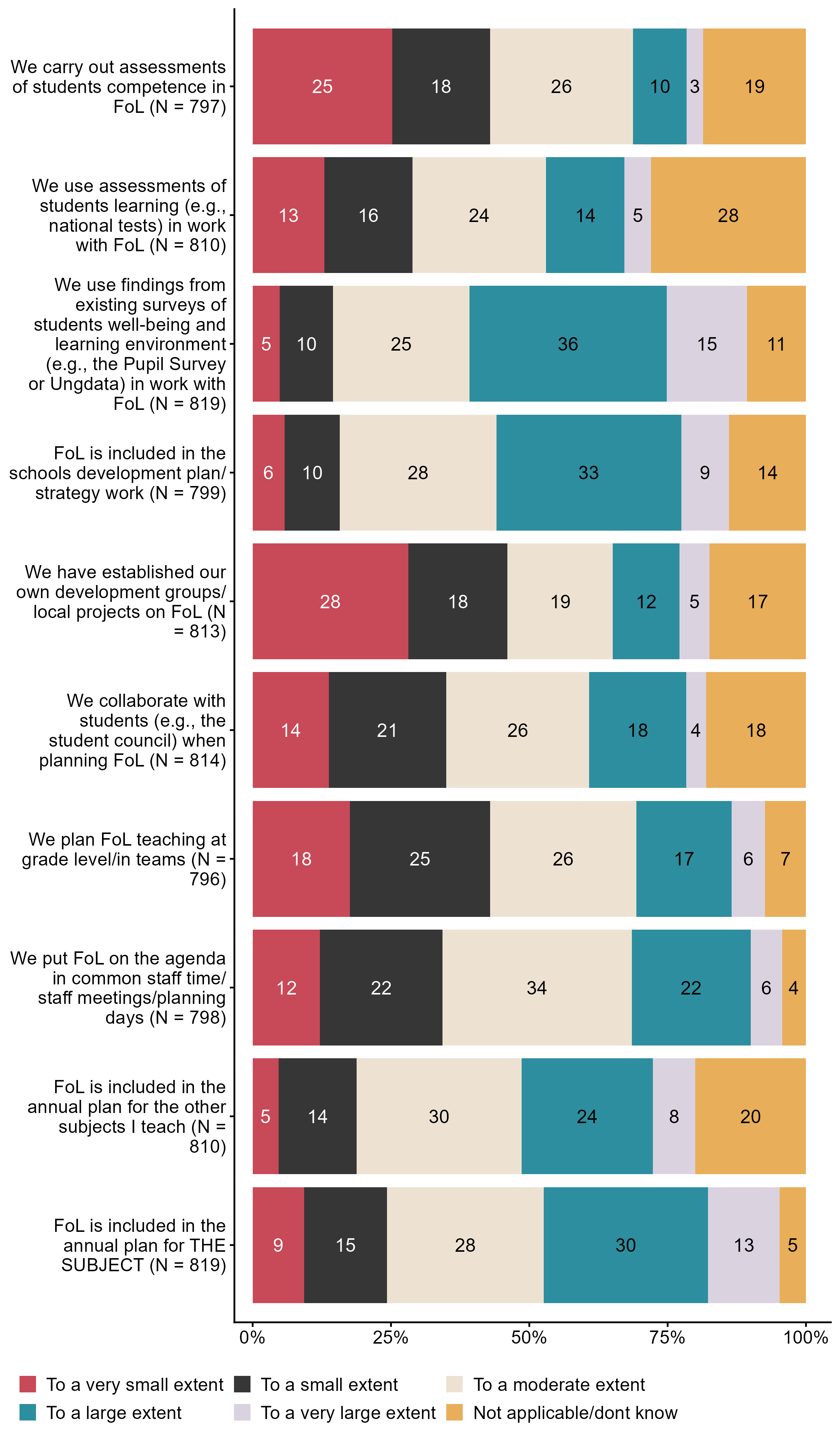 Figur 7.8.How do you work with public health and life skills (FoL) at your school?. N = [796–819], Figur (PNG), Figurdata (XLSX). (Q_LS21_1,Q_LS21_2,Q_LS21_3,Q_LS21_4,Q_LS21_5,Q_LS21_6,Q_LS22_1,Q_LS22_2,Q_LS22_3,Q_LS22_4)