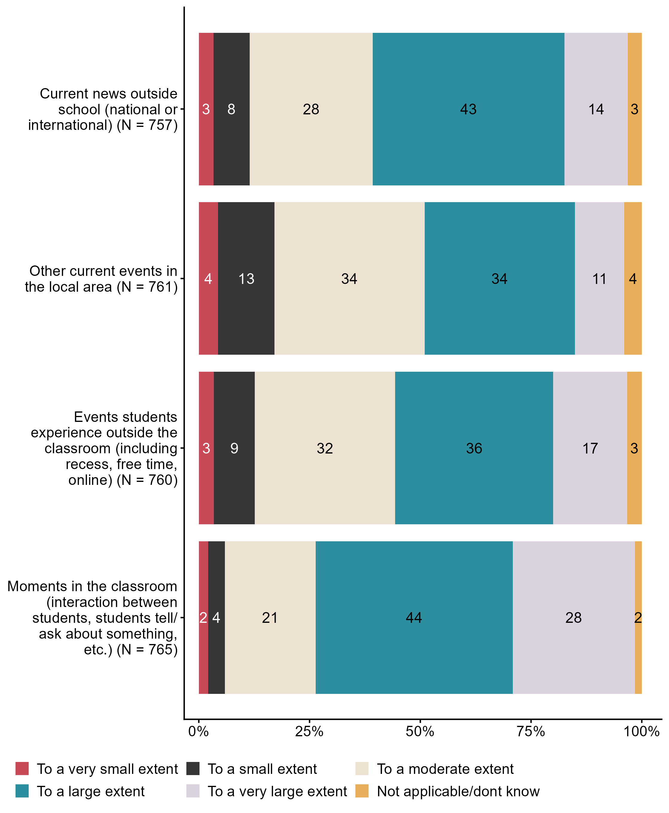 Figur 7.11.Work with FoL can be planned, but can also occur spontaneously, often called ‘learning moments’. To what extent do you facilitate learning about public health and life skills in the following learning moments?. N = [757–765], Figur (PNG), Figurdata (XLSX). (Q_LS25_1,Q_LS25_2,Q_LS25_3,Q_LS25_4)