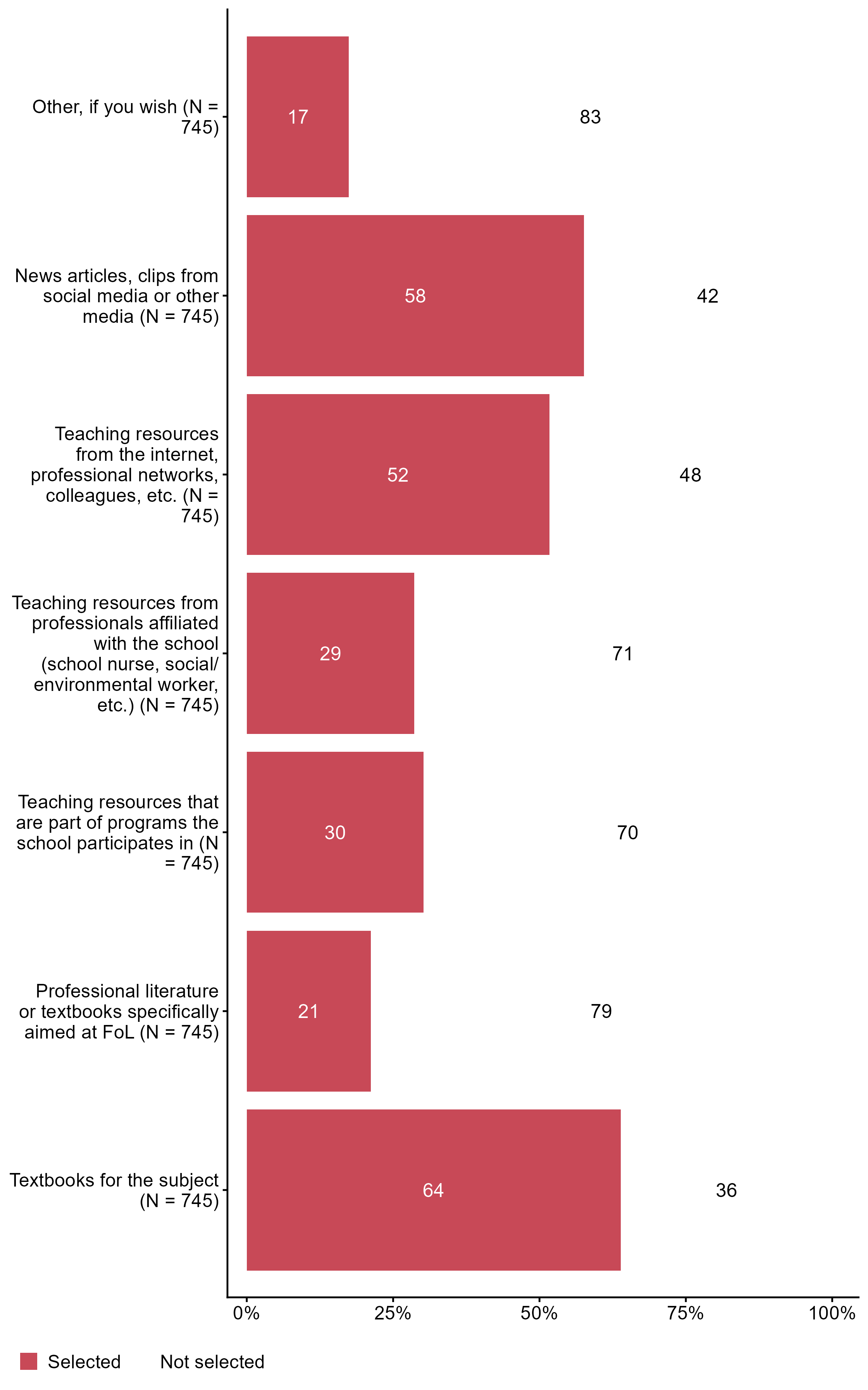 Figur 7.10.Which sources do you usually use to teach public health and life skills (FoL) in THE SUBJECT?. N = 745, Figur (PNG), Figurdata (XLSX). (Q_LS24_1,Q_LS24_28,Q_LS24_29,Q_LS24_30,Q_LS24_31,Q_LS24_32,Q_LS24_33)