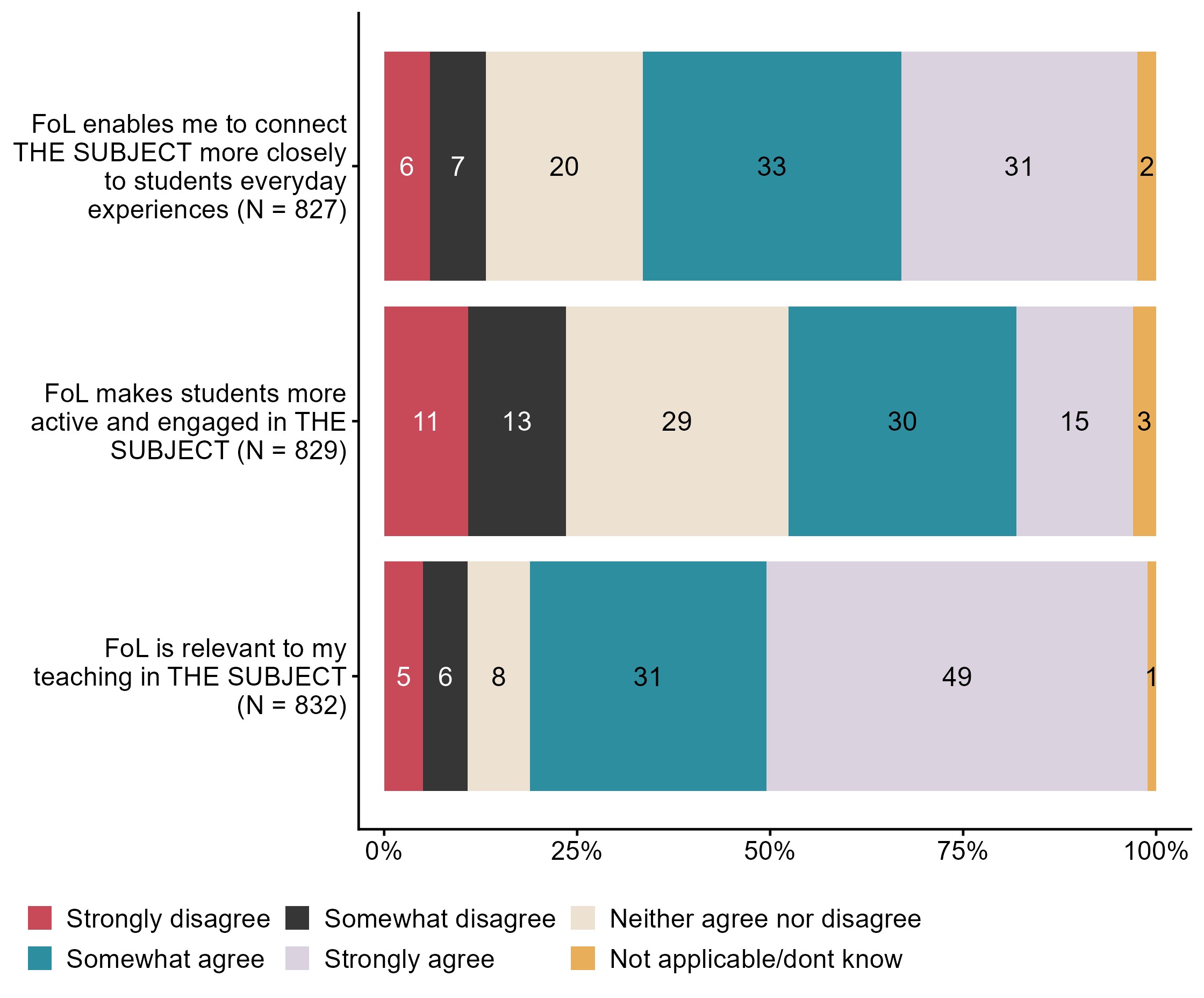 Figur 7.7.How much do you disagree/agree with the following statements about work with public health and life skills (FoL) in THE SUBJECT?. N = [827–832], Figur (PNG), Figurdata (XLSX). (Q_LS19_1,Q_LS19_2,Q_LS19_3)