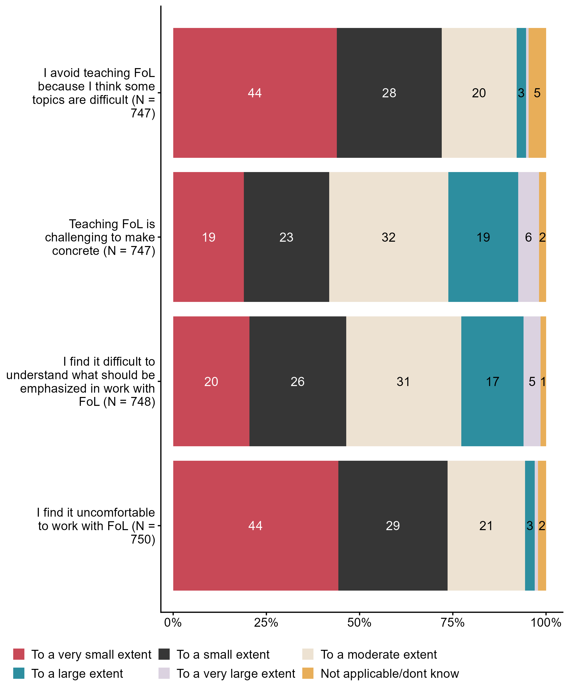 Figur 7.13.To what extent do you experience challenges connected to work with public health and life skills (FoL)?. N = [747–750], Figur (PNG), Figurdata (XLSX). (Q_LS28_1,Q_LS28_2,Q_LS28_3,Q_LS28_4)