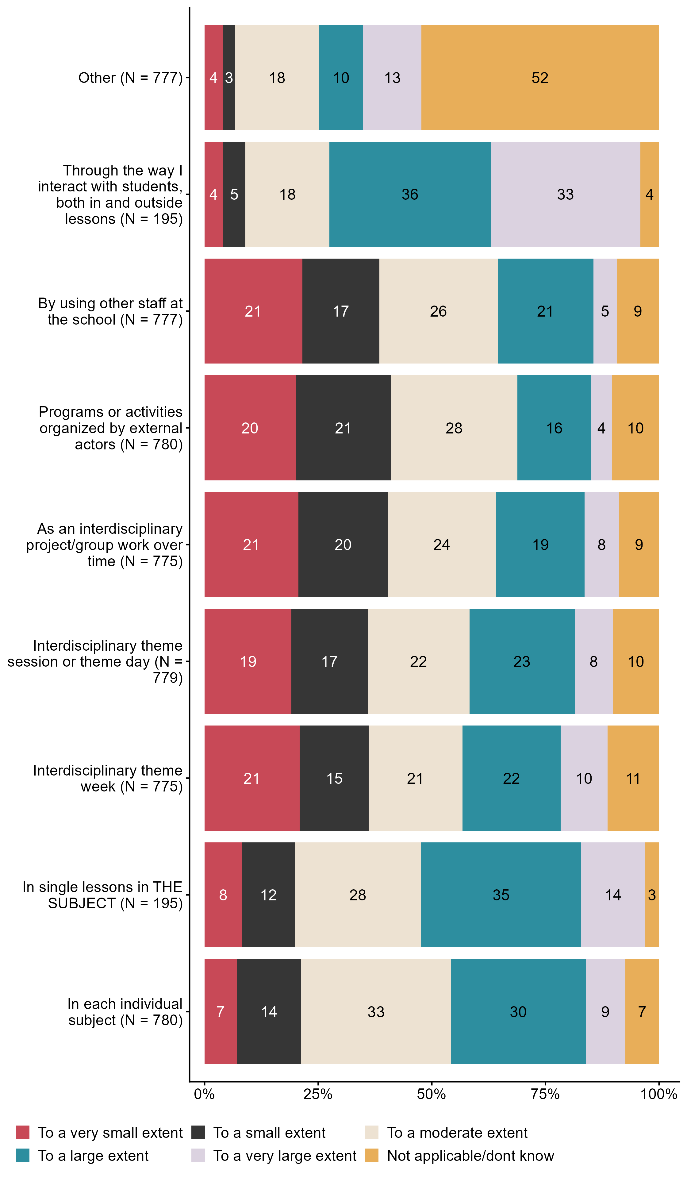 Figur 7.9.How do you organize work with public health and life skills?. N = [195–780], Figur (PNG), Figurdata (XLSX). (Q_LS23_1,Q_LS23_2,Q_LS23_3,Q_LS23_4,Q_LS23_5,Q_LS23_6,Q_LS23_7,Q_LS23_8,Q_LS23_9)