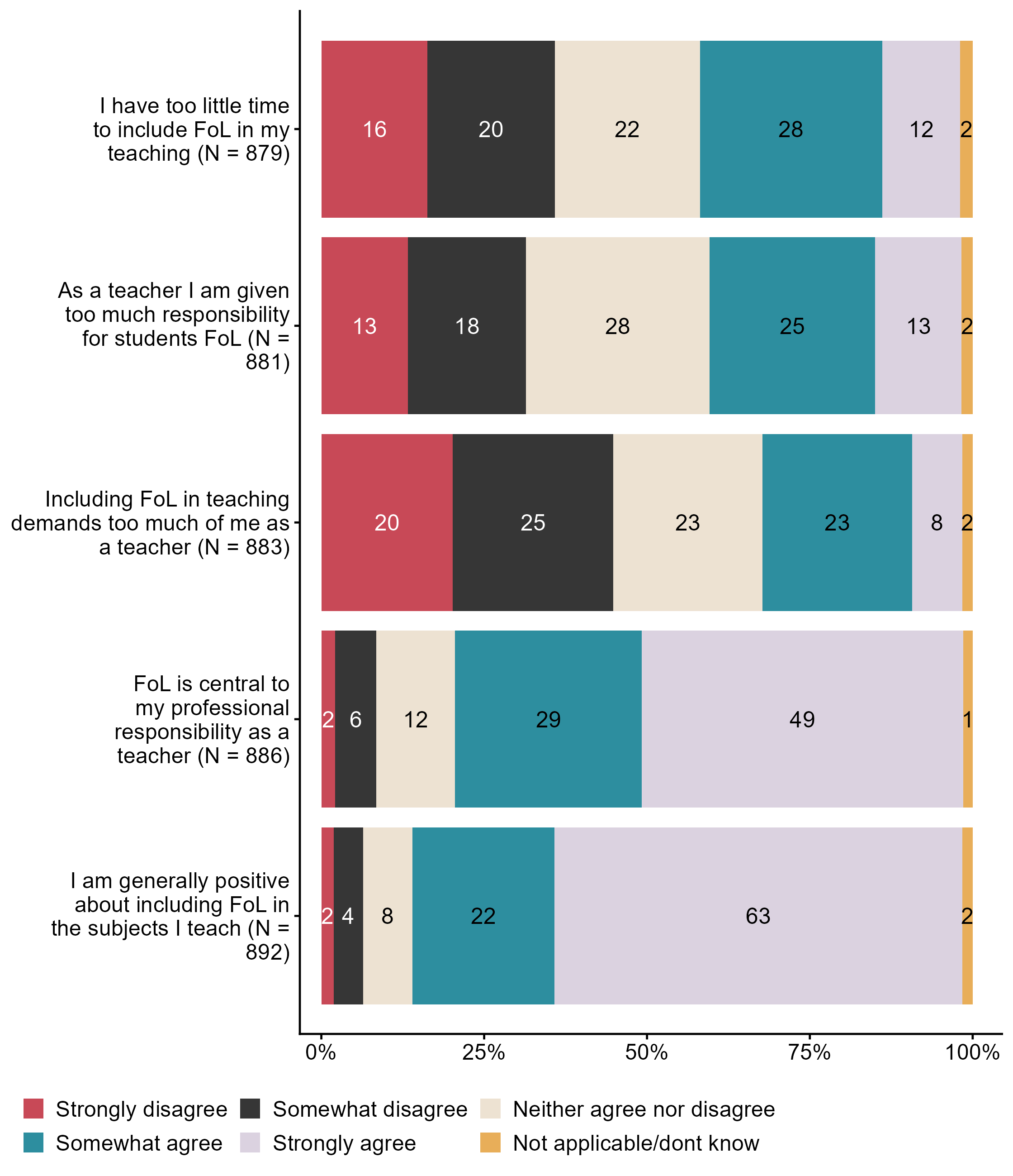 Figur 7.4.How do you view your work with public health and life skills (FoL)?. N = [879–892], Figur (PNG), Figurdata (XLSX). (Q_LS15_1,Q_LS15_2,Q_LS15_3,Q_LS15_4,Q_LS15_5)