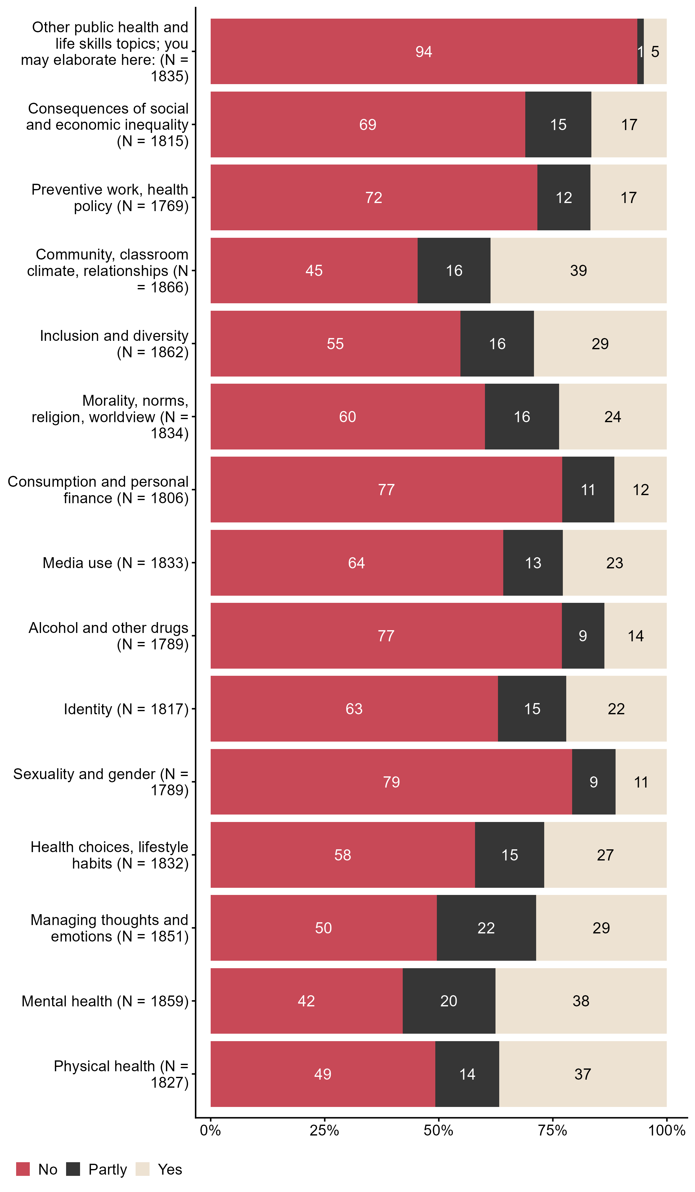 Figur 8.3.Did you include any of the following public health and life skills topics in this lesson?. N = [1769–1866], Figur (PNG), Figurdata (XLSX). (Q_LG14_1,Q_LG14_2,Q_LG14_3,Q_LG14_4,Q_LG14_5,Q_LG14_6,Q_LG14_7,Q_LG14_8,Q_LG14_9,Q_LG14_10,Q_LG14_11,Q_LG14_12,Q_LG14_13,Q_LG14_14,Q_LG14_15)