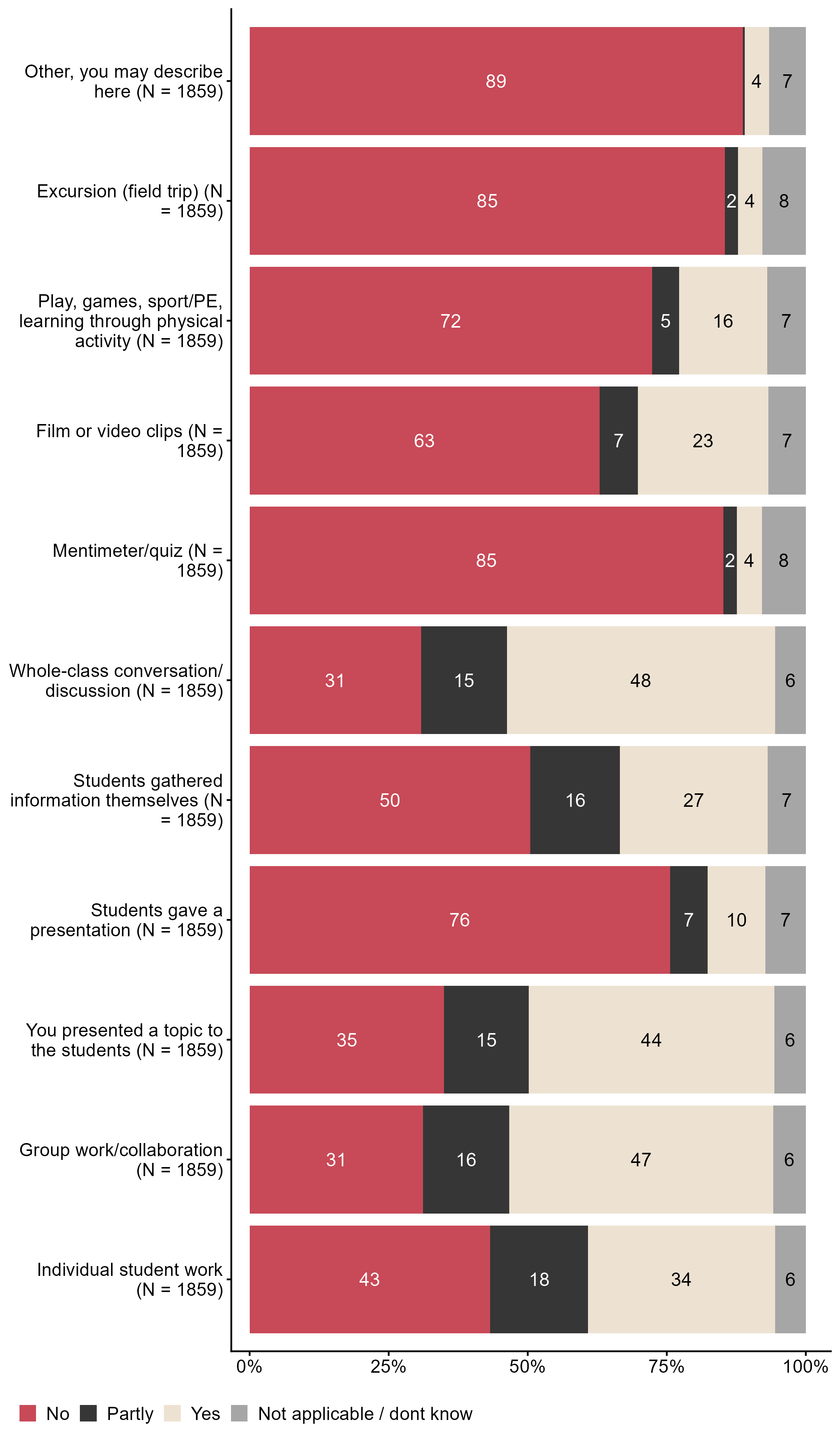 Figur 8.8.Did you use the following learning activities when you worked with public health and life skills in the lesson?. N = 1859, Figur (PNG), Figurdata (XLSX). (Q_LG19_1,Q_LG19_2,Q_LG19_3,Q_LG19_4,Q_LG19_5,Q_LG19_6,Q_LG19_7,Q_LG19_8,Q_LG19_9,Q_LG19_10,Q_LG19_11)
